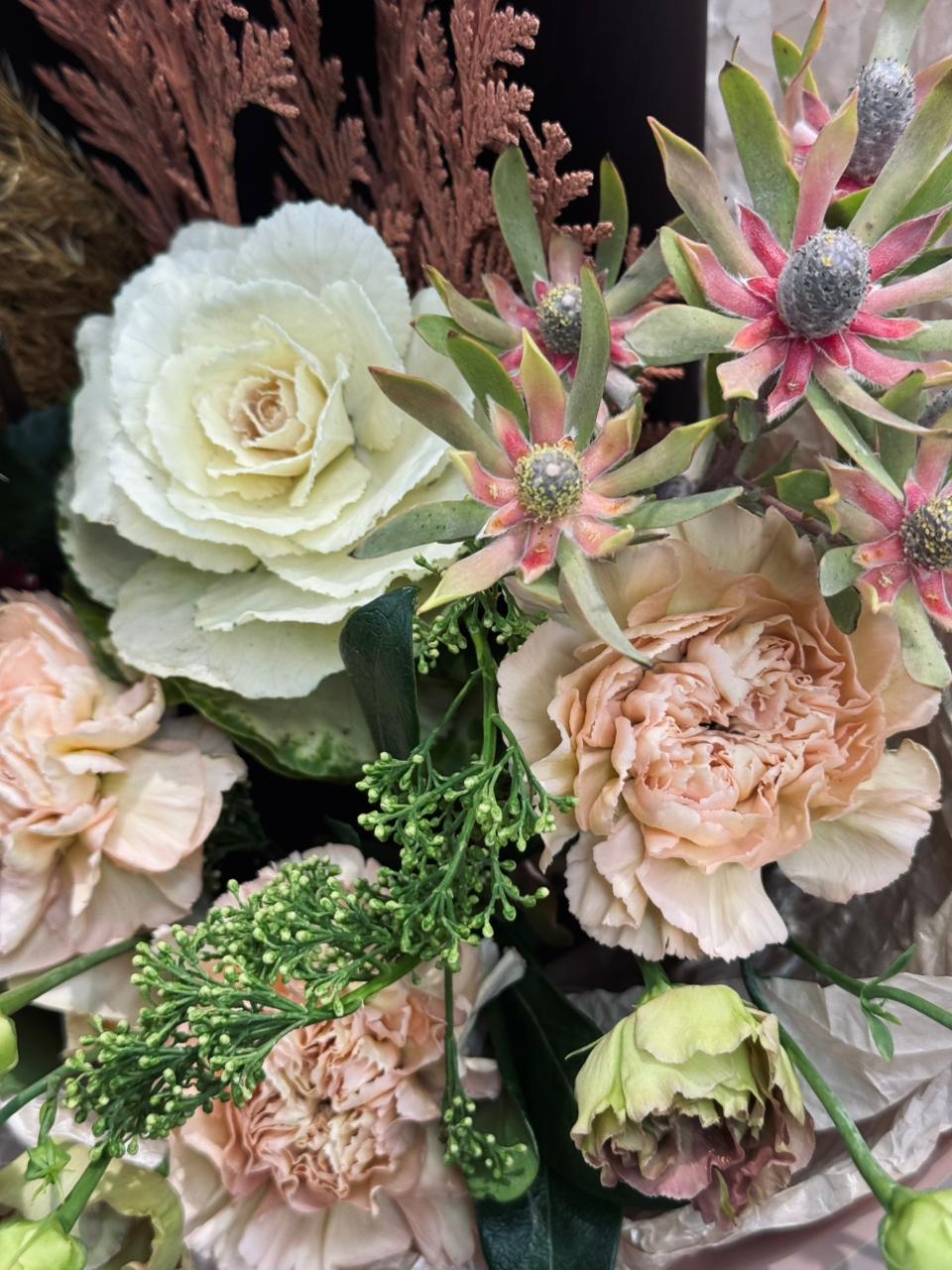 Букет «Влюблённость Николь» — это букет, в котором роскошь брассики сочетается с надеждой скиммии и душевностью эустомы. Каждый элемент композиции рассказывает историю настоящей любви — красивой, верной и искренней. Этот букет станет идеальным выражением самых светлых и трепетных чувств, подчеркивая уникальность и глубину ваших отношений.
