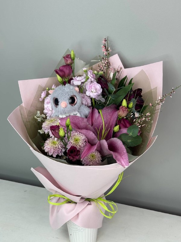 Букет с совушкой, лилией и хризантемой — уютная, трогательная композиция, в которой благородная лилия сочетается с объёмной хризантемой. Крупные цветы создают гармоничную текстуру и глубину, а фигурка совушки добавляет тепла, мудрости и лёгкой игривости. Букет выглядит стильно и душевно, оставаясь уместным в повседневной жизни: для подарка без повода, украшения интерьера или просто как тёплый жест внимания. Нежно, с характером, с совиным шармом.