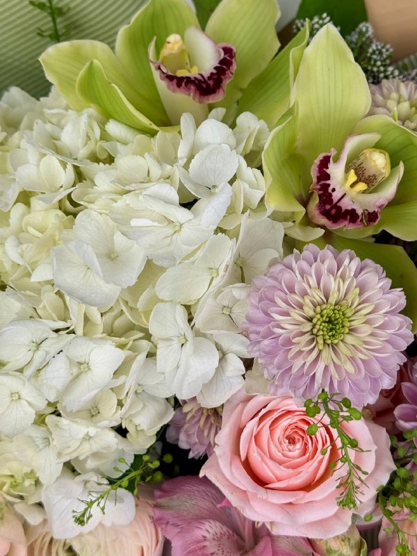 Букет «Как в сказке» — волшебная, невесомая композиция, в которой пышная гортензия сочетается с изящными орхидеями и нежными ранункулюсами. Мягкие объёмы, воздушные линии и утончённые текстуры создают ощущение лёгкой сказочности без излишней театральности. Букет выглядит свежо, стильно и мечтательно, оставаясь уместным в повседневной жизни: для подарка без повода, встречи или просто как красивый жест внимания. Нежно, воздушно, с настроением чуда.