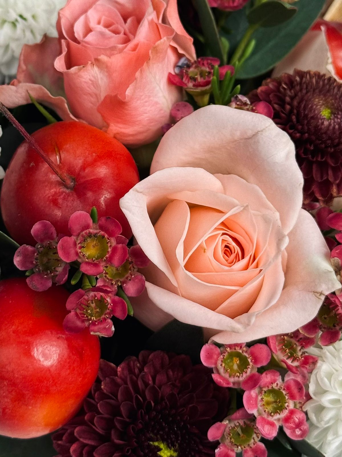 Композиция «Ароматный чай» — это уютное воплощение тепла, душевного общения и сладкой безмятежности. Она напоминает о приятной паузе за чашкой свежезаваренного чая, когда время замедляется, а разговор течет неспешно и легко. Сочетание сочных яблок, солнечных лимонов и нежной розы создаёт не просто композицию, а настоящую атмосферу для отдыха, наполняя пространство гармонией и лёгким фруктово-цветочным ароматом.