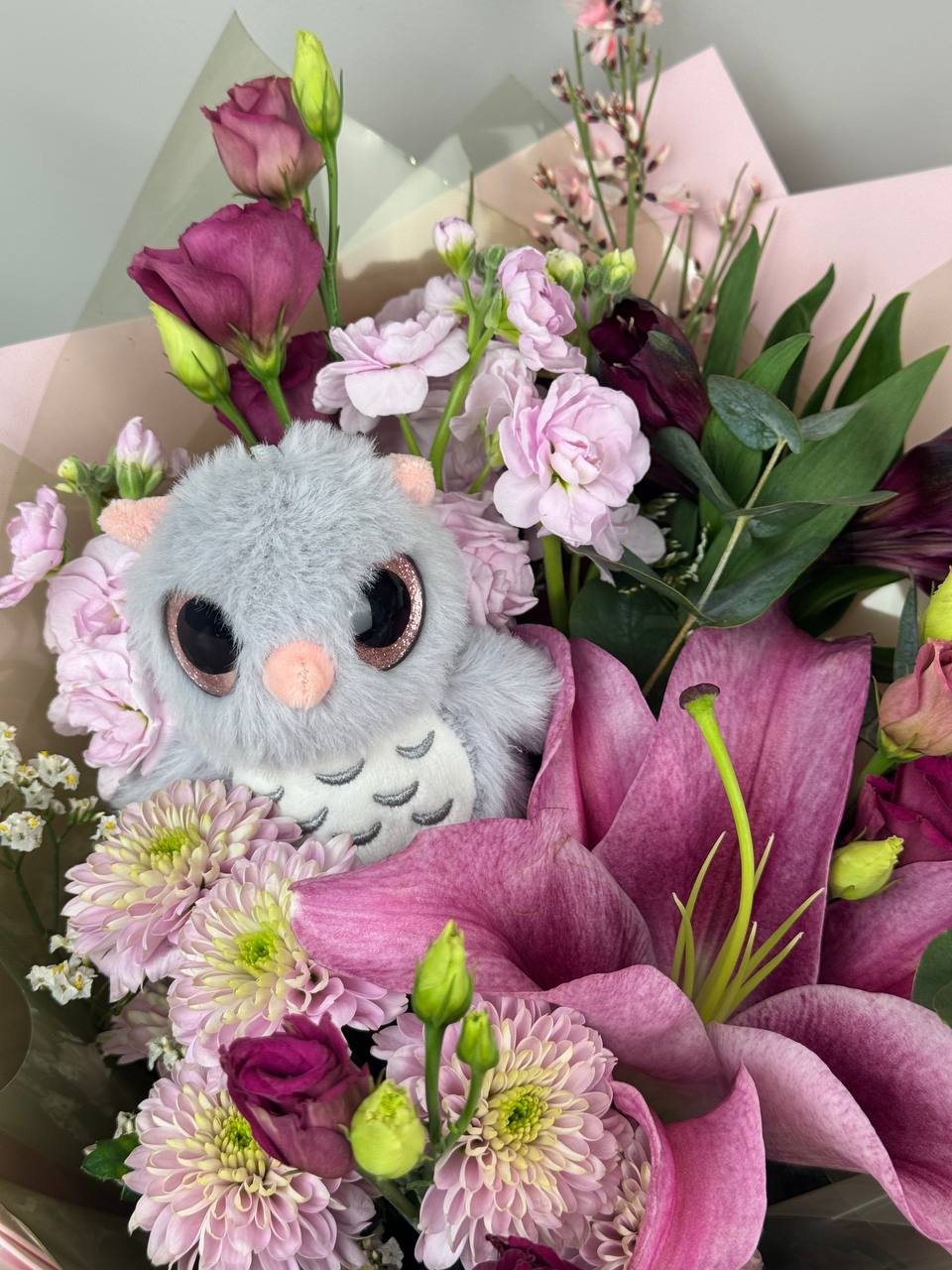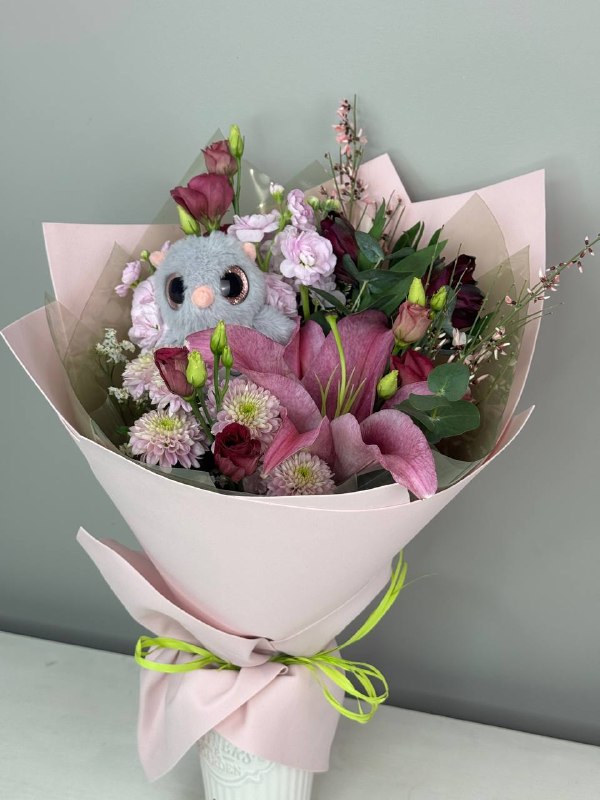 Букет с совушкой, лилией и хризантемой — уютная, трогательная композиция, в которой благородная лилия сочетается с объёмной хризантемой. Крупные цветы создают гармоничную текстуру и глубину, а фигурка совушки добавляет тепла, мудрости и лёгкой игривости. Букет выглядит стильно и душевно, оставаясь уместным в повседневной жизни: для подарка без повода, украшения интерьера или просто как тёплый жест внимания. Нежно, с характером, с совиным шармом.