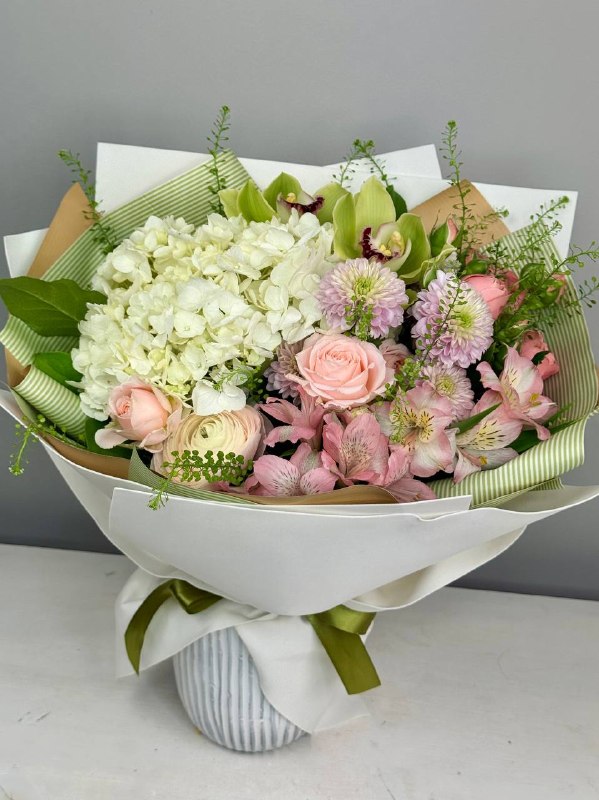 Букет «Как в сказке» — волшебная, невесомая композиция, в которой пышная гортензия сочетается с изящными орхидеями и нежными ранункулюсами. Мягкие объёмы, воздушные линии и утончённые текстуры создают ощущение лёгкой сказочности без излишней театральности. Букет выглядит свежо, стильно и мечтательно, оставаясь уместным в повседневной жизни: для подарка без повода, встречи или просто как красивый жест внимания. Нежно, воздушно, с настроением чуда.