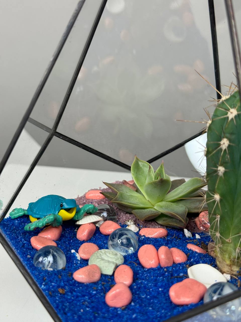 Стеклянный сосуд, в котором размещены кактусы, позволяет наблюдать за ростом и развитием растений, создавая визуально привлекательный акцент. Украшенные камнями, флорариум приобретает особую изысканность и изящность, добавляя интерьеру загадочности и очарования.