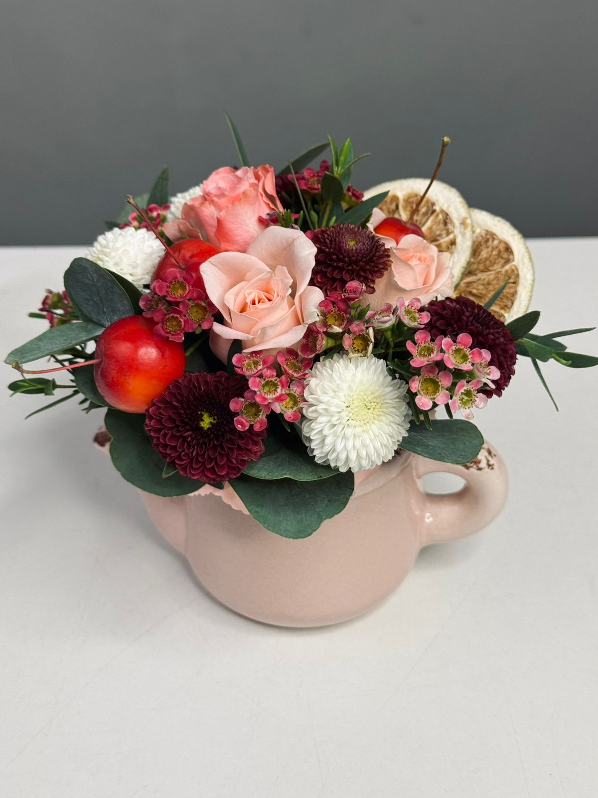 Композиция «Ароматный чай» — это уютное воплощение тепла, душевного общения и сладкой безмятежности. Она напоминает о приятной паузе за чашкой свежезаваренного чая, когда время замедляется, а разговор течет неспешно и легко. Сочетание сочных яблок, солнечных лимонов и нежной розы создаёт не просто композицию, а настоящую атмосферу для отдыха, наполняя пространство гармонией и лёгким фруктово-цветочным ароматом.