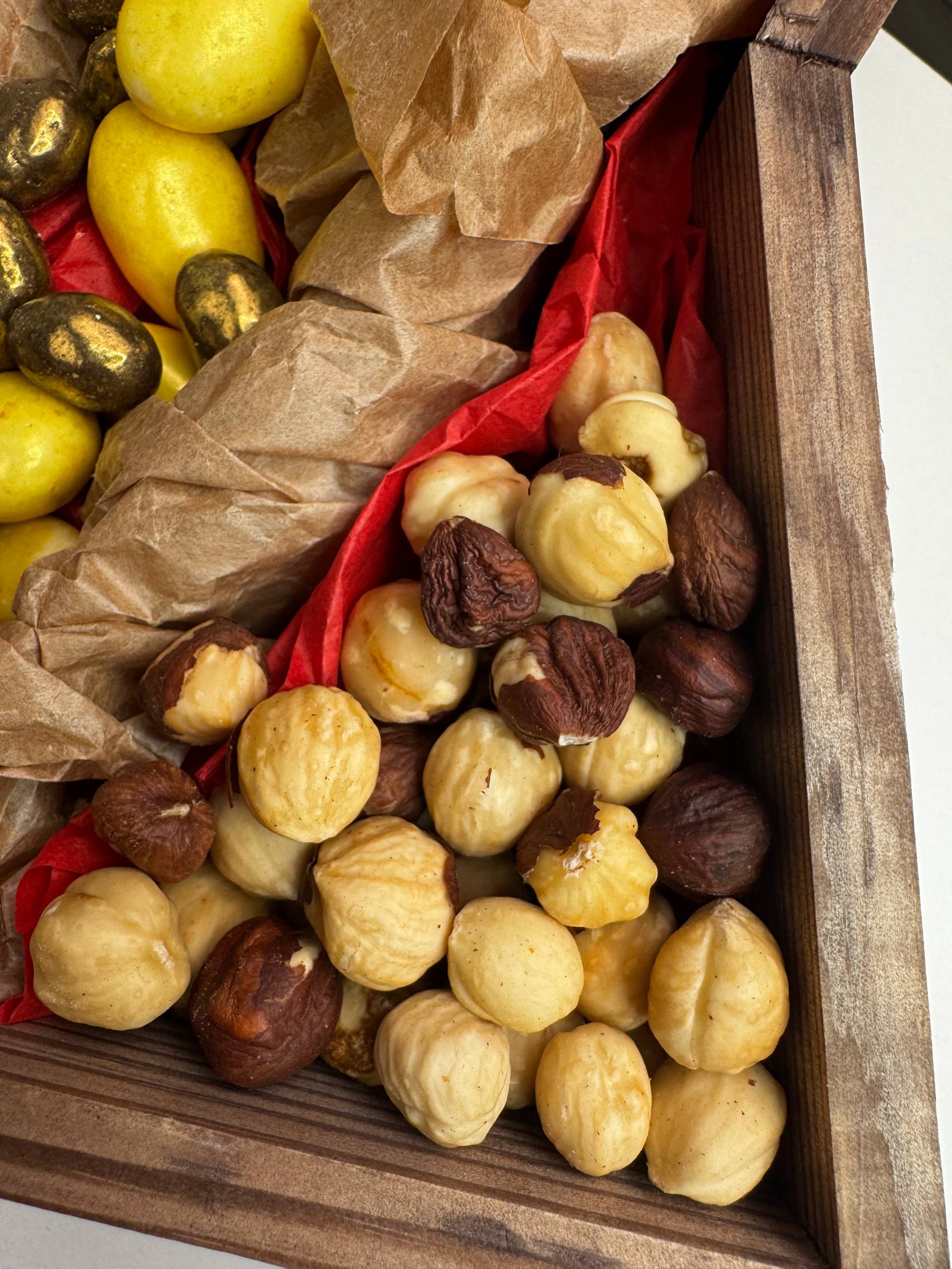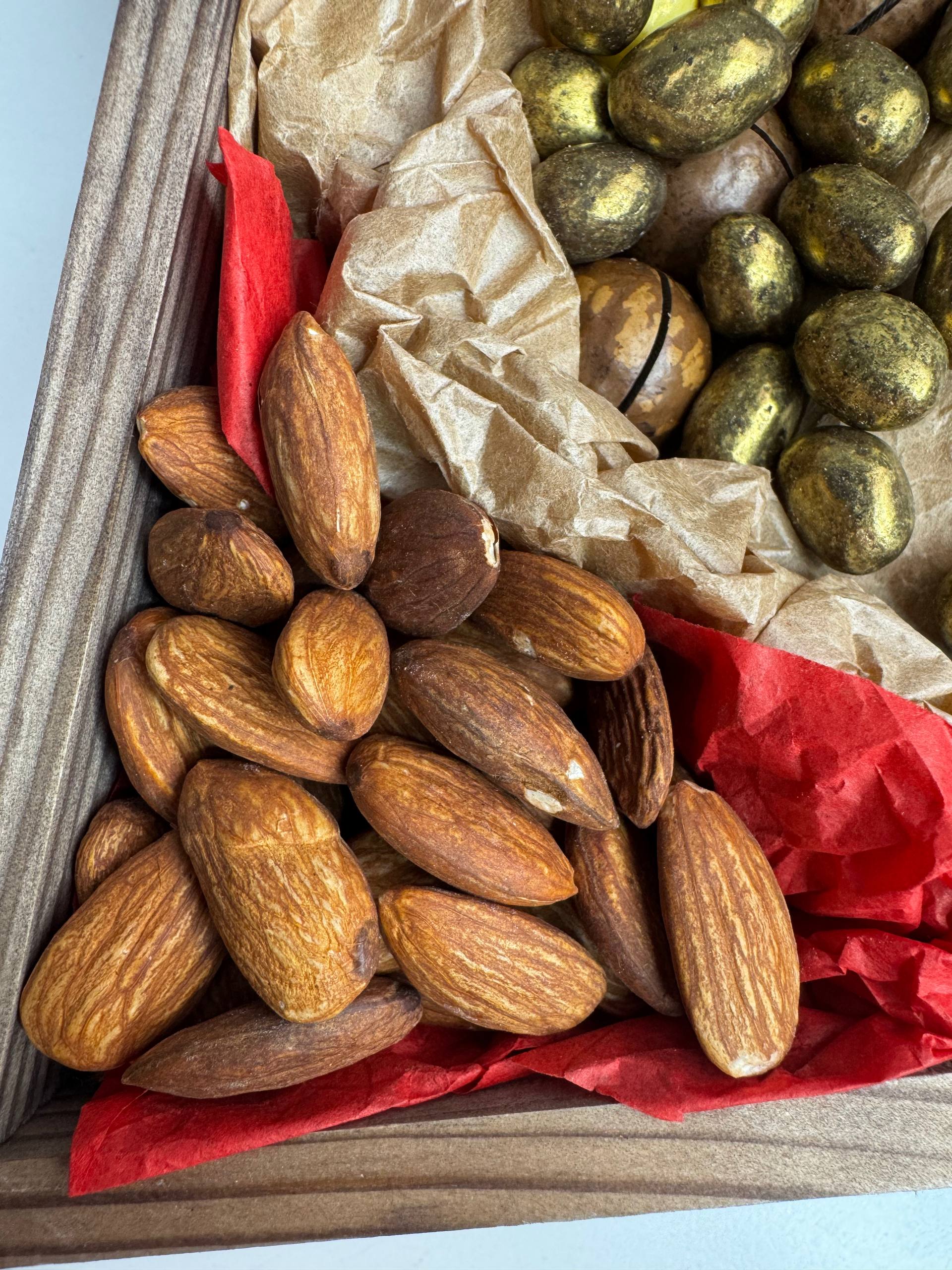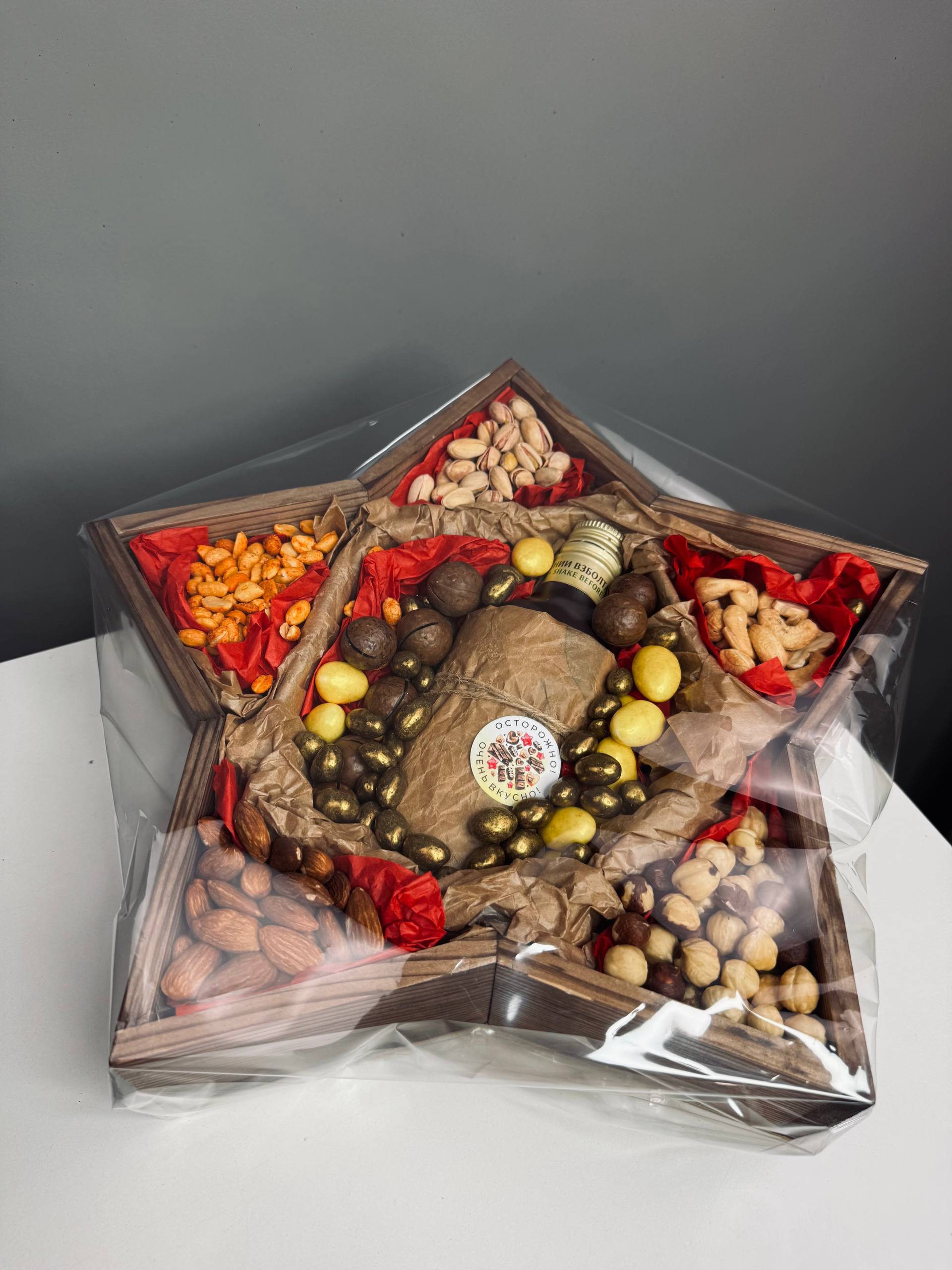 Солидно и мужественно. Декоративный деревянный ящик в форме звезды (35.5х35.5х7см) - это не просто упаковка, а стильный аксессуар для кабинета или бара. После орехов он станет хранилищем для важных мелочей или классным элементом декора. Мужской Подарок