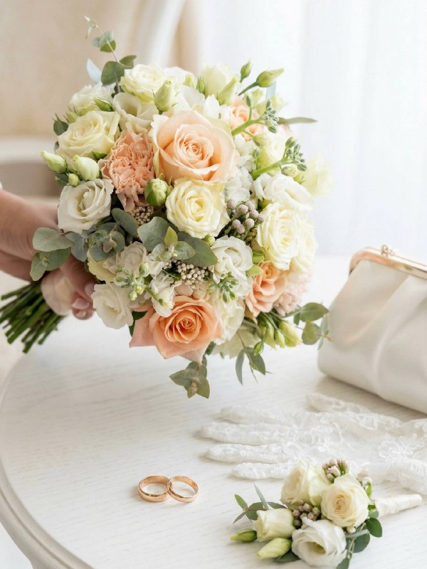 Букет невесты «Катарина». Тёплый персик, трогательный белый и лёгкий розовый оттенок переплелись в нём, как два сердца, нашедшие друг друга. Это не просто цветы — это предчувствие самого счастливого дня. ✨
