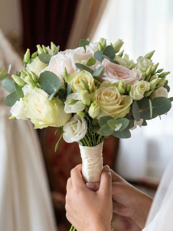 Букет невесты «Сисиль». В нём всё идеально: благородство пионовидных роз, нежный шёпот белой эустомы и свежесть эвкалипта, словно память о вашем первом совместном рассвете. Этот букет создан для той, кто чувствует красоту в каждой детали.