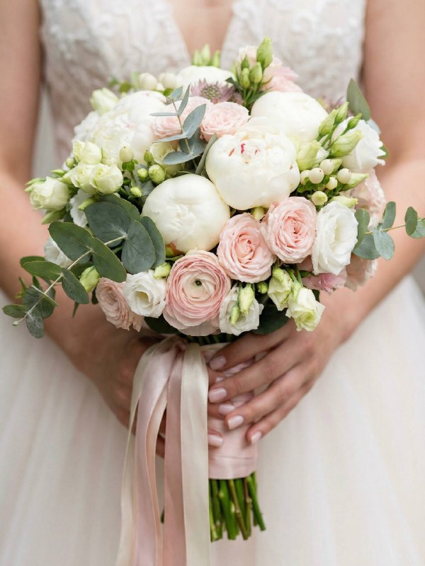 Нежная бело-розовая гамма раскрывается в роскошных белых пионах, розовых пионовидных розах, воздушной белой эустоме (лизиантусе) и ароматном эвкалипте. Этот букет словно сошел с обложки самого красивого свадебного журнала. Но если вам хочется добавить свою ноту - мы только за! Вы всегда можете внести дополнения и изменения, чтобы букет зазвучал именно вашей мелодией.