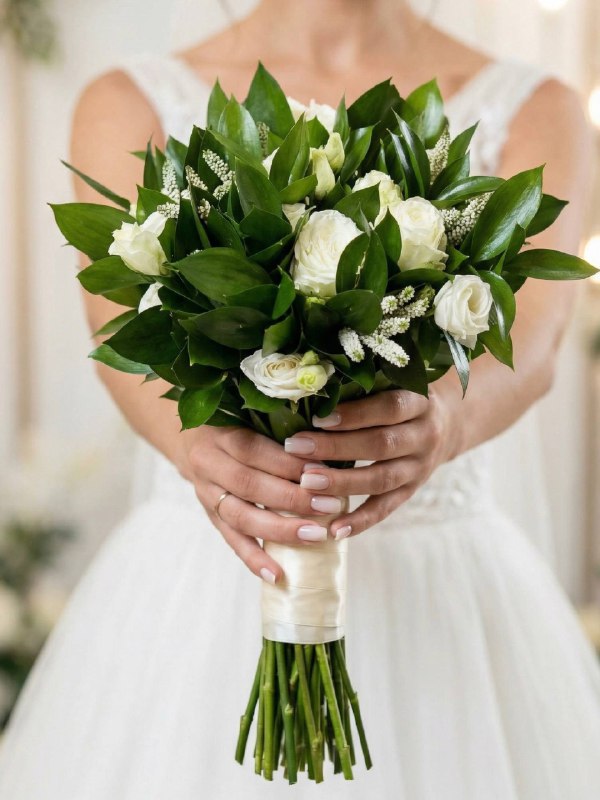 Свежая зелено-белая гамма раскрывается в насыщенной, сочной зелени и белоснежных акцентах: нежные розы, воздушная вероника и изящная белая эустома создают образ утонченной натуральности и природной красоты. Это выбор невесты, которая ценит элегантную простоту и благородство. Но если вам захочется добавить что-то своё - мы только рады! Вы всегда можете внести дополнения и изменения, чтобы букет стал идеальным отражением именно вашего вкуса.