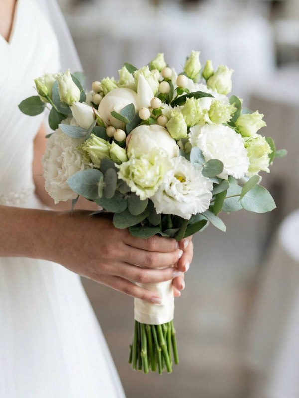 Нежная бело-зеленая гамма раскрывается в роскошных белых пионах, трогательных белых ягодках гиперикума, которые словно светятся изнутри, и белоснежной эустоме. Эта композиция - воплощение чистоты и элегантности. Такая цветовая история идеально впишется в любой свадебный стиль: от богемного до классического. И помните: это лишь основа для вашей фантазии. Вы всегда можете внести дополнения и изменения, чтобы букет зазвучал именно вашей мелодией.