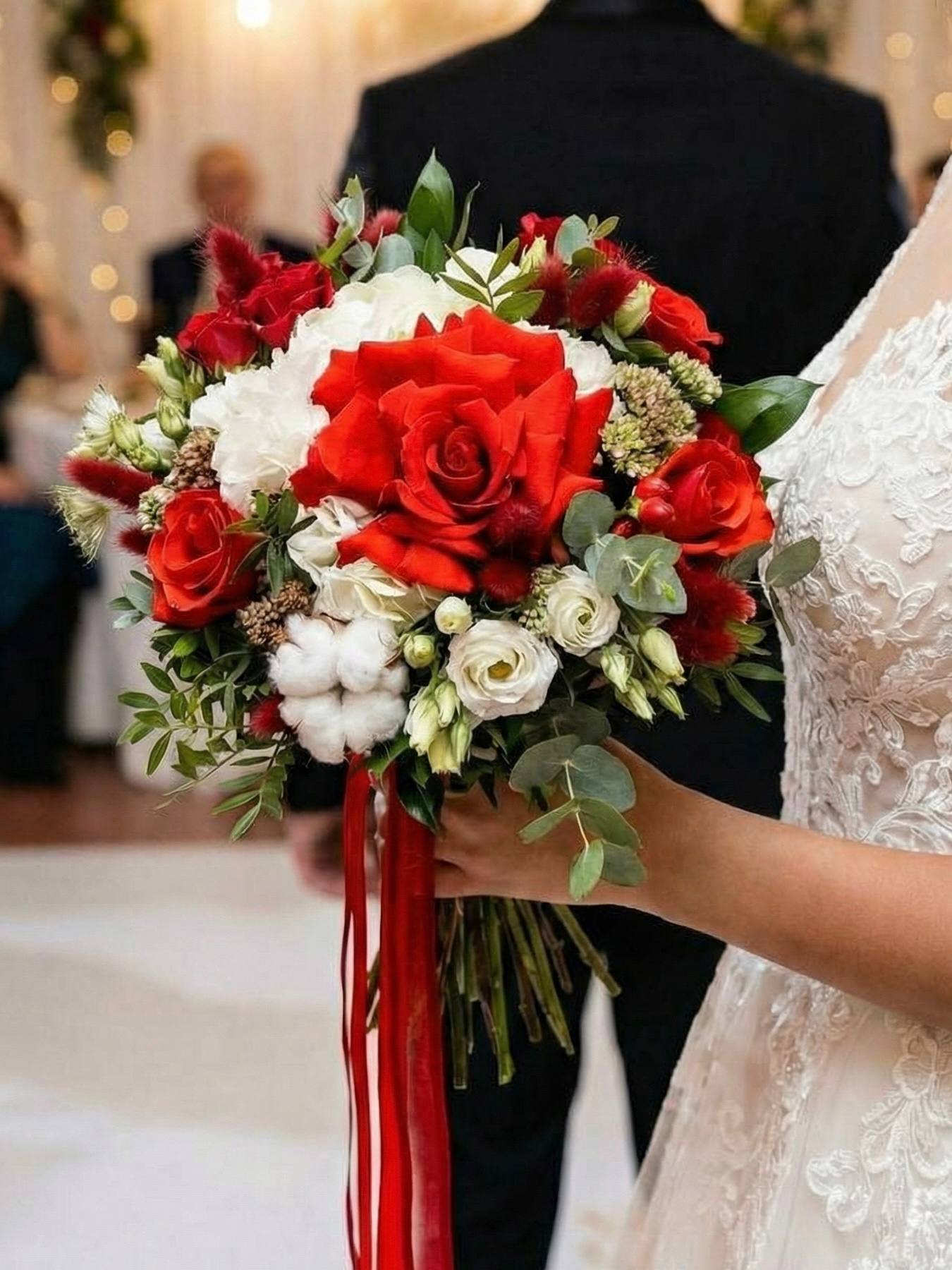 Глубокая красная гамма - это выбор невесты, которая не боится быть в центре внимания и хочет заявить о своих чувствах громко и красиво. Шикарная алая французская роза задаёт тон, белые акценты эустомы и гортензии добавляют нежности, хлопок приносит нотку домашнего тепла, а красный лагурус и зелень делают композицию объёмной и фактурной. Это букет-заявление, букет-эмоция. И помните: это лишь основа для вашей фантазии. Вы всегда можете внести дополнения и изменения, чтобы «Настасия» зазвучала именно вашей мелодией.