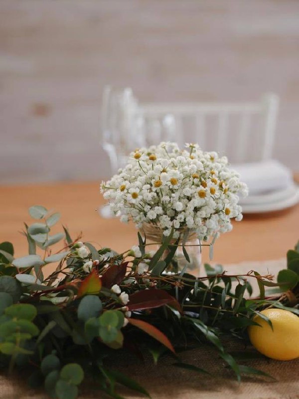 Белый + теплое дерево + сочная зелень + солнечный желтый. Идеальная формула летнего настроения, которое будет актуально и в свадебном оформлении 2026.
