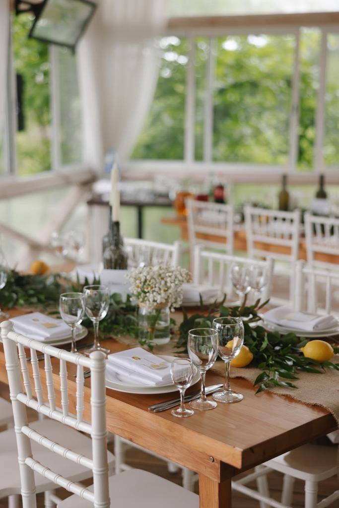 Представьте: панорамные окна, залитые светом, деревянные столы, дышащие текстурой, льняные дорожки, небрежно брошенная зелень и желтые акценты спелых лимонов. Никакой вычурности. Только pure, натуральное, живое. Ваша свадьба будет похожа на уютный ужин на вилле в Тоскане, куда приехали самые близкие.