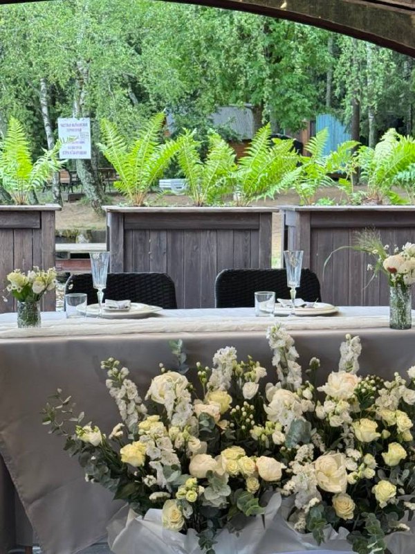- Сбор композиций: гостевые столы, президиум молодоженов, фуршетные зоны - каждая веточка дышит в унисон с рекой.