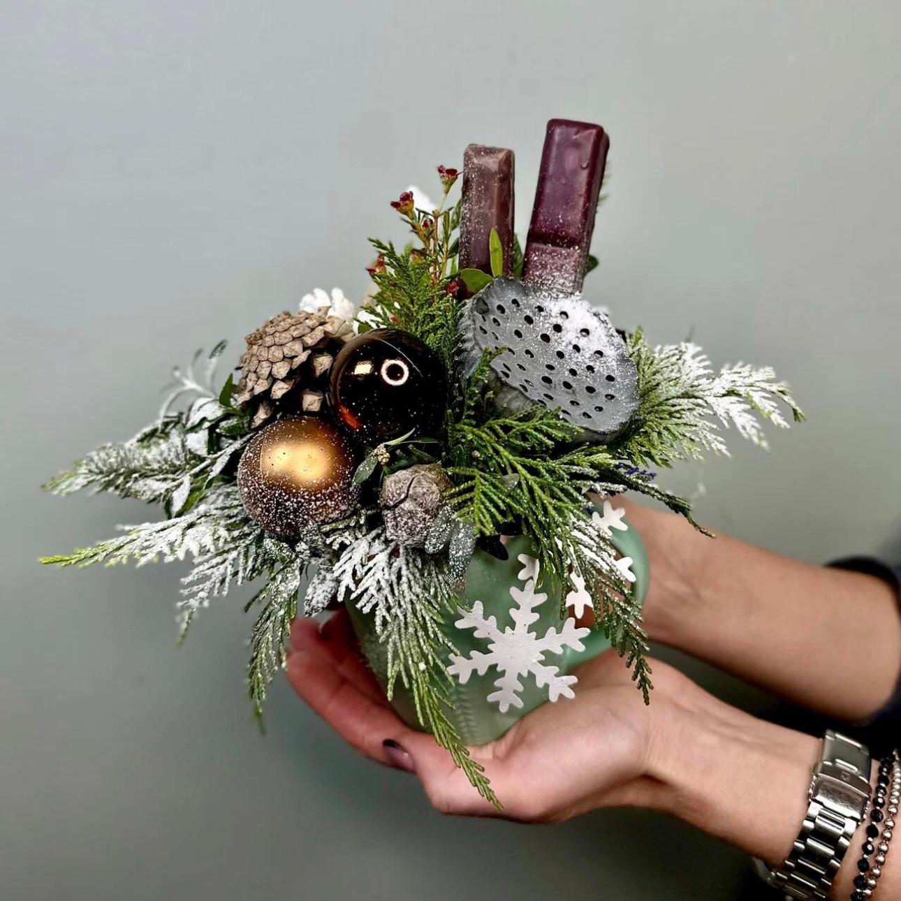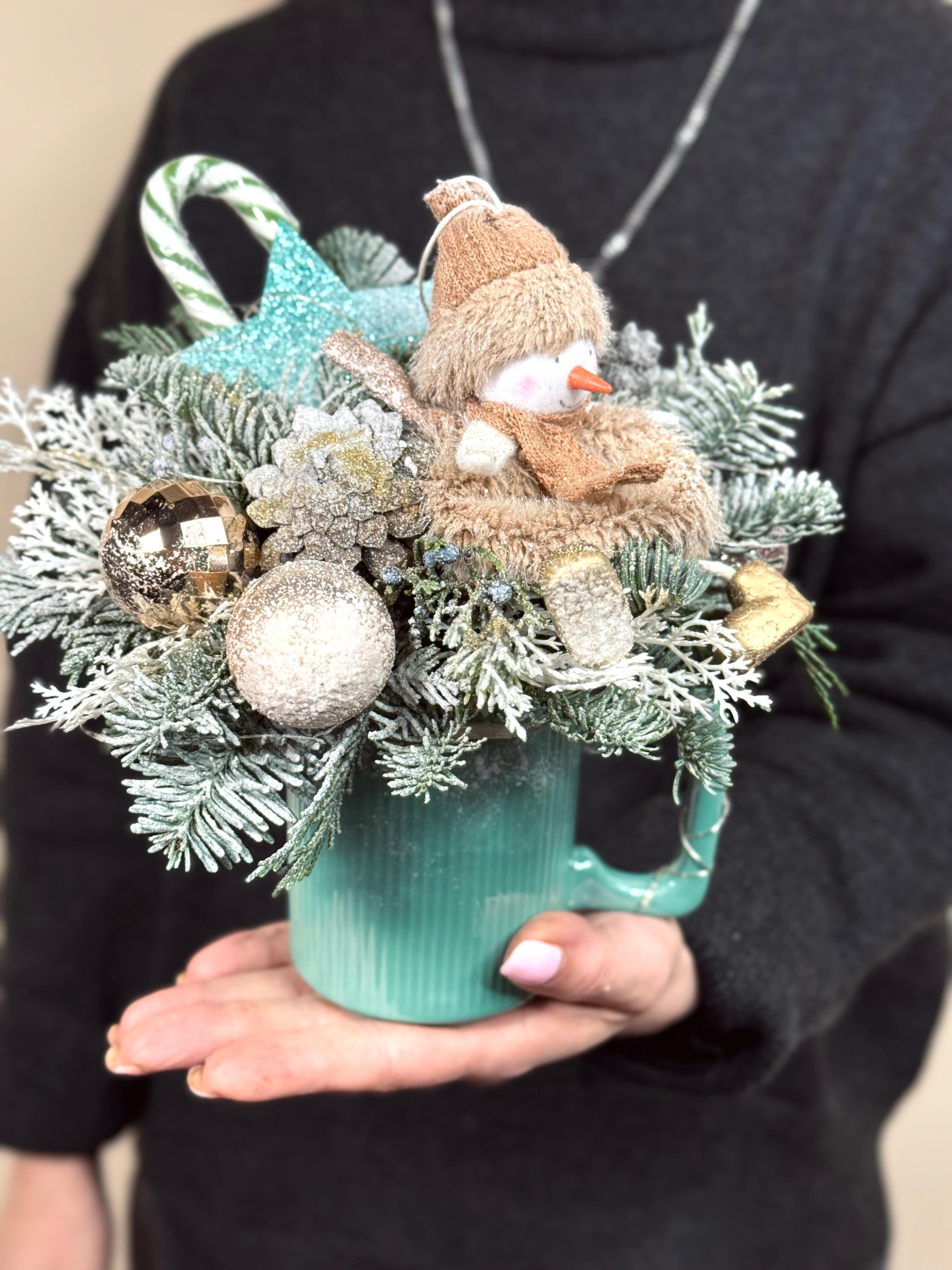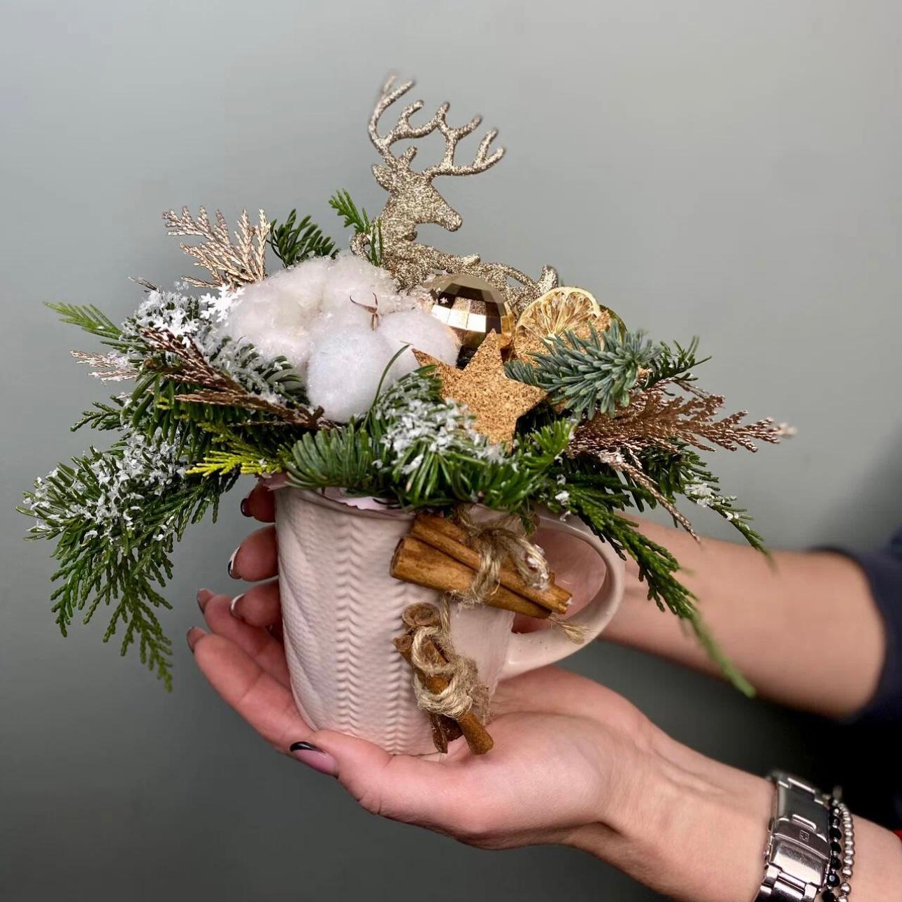 - Унесет с собой готовый результат: гордость за самостоятельно созданный шедевр — красивую зимнюю композицию в кружке, которую не стыдно подарить близким или поставить на полку в своей комнате.