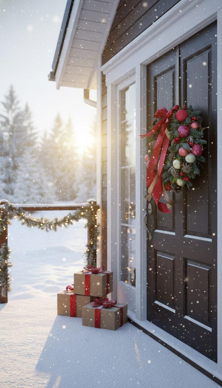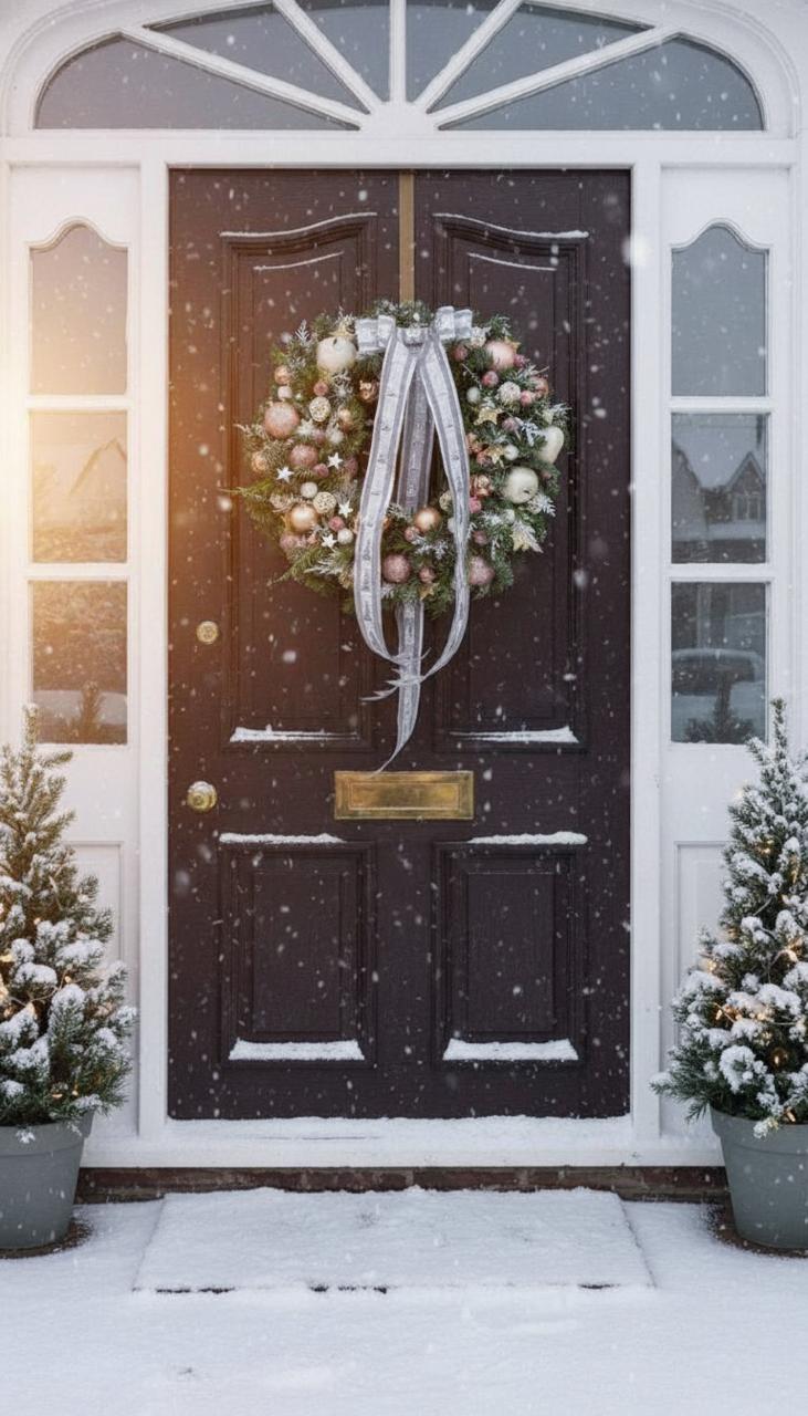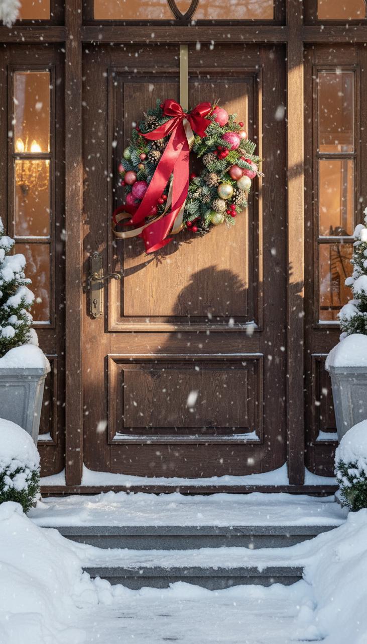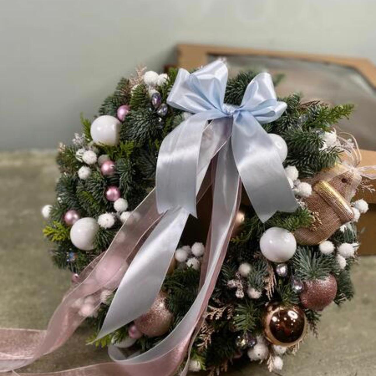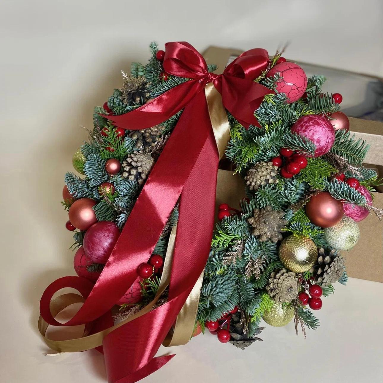Эффектный результат: сочетание живых веток, мерцающих гирлянд, нарядных шаров и роскошных бархатных лент делает венок по-настоящему шикарным.