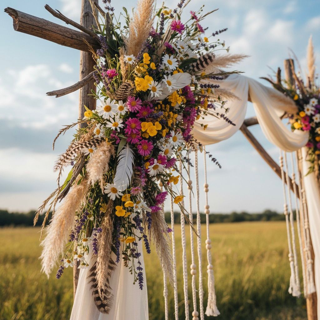 - Бохо: Свобода и романтика полевых цветов, трав и воздушных перьев.